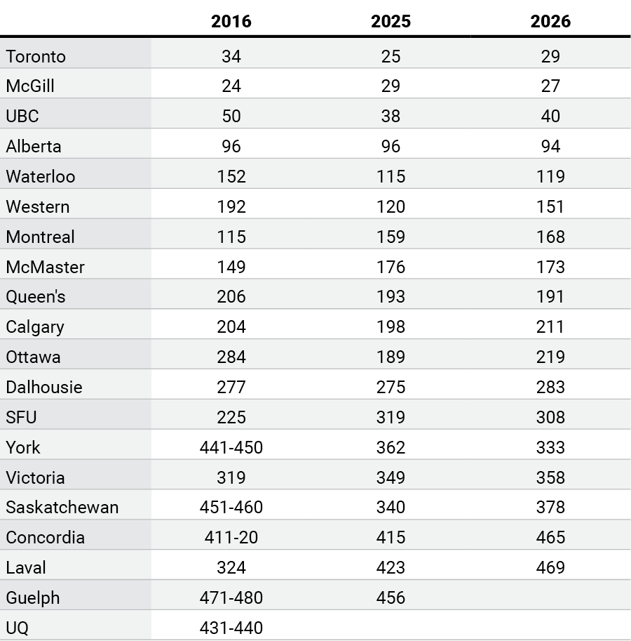Most years, I do a quick overview of the major international rankings and how Canadian institutions have fared in them. Today is the day I do that for the 2026 rankings from the Times Higher and QS, as well as the 2025 Shanghai Ranking (Shanghai is dated the year they come out, Times Higher and QS are numbered like automobiles, one year ahead of the release date). In a bit of a departure from past practice, I am going to show not just how results have changed over the past year, but the past decade as well.