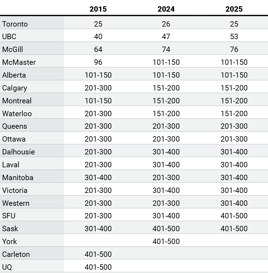 Figure 4: Change in rankings, Canadian universities, 2015-2025