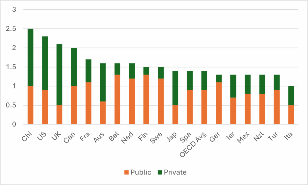 Figure 1: Public and Private Expenditure on Tertiary Institutions as a Percentage of GDP, Select OECD Countries, 2022