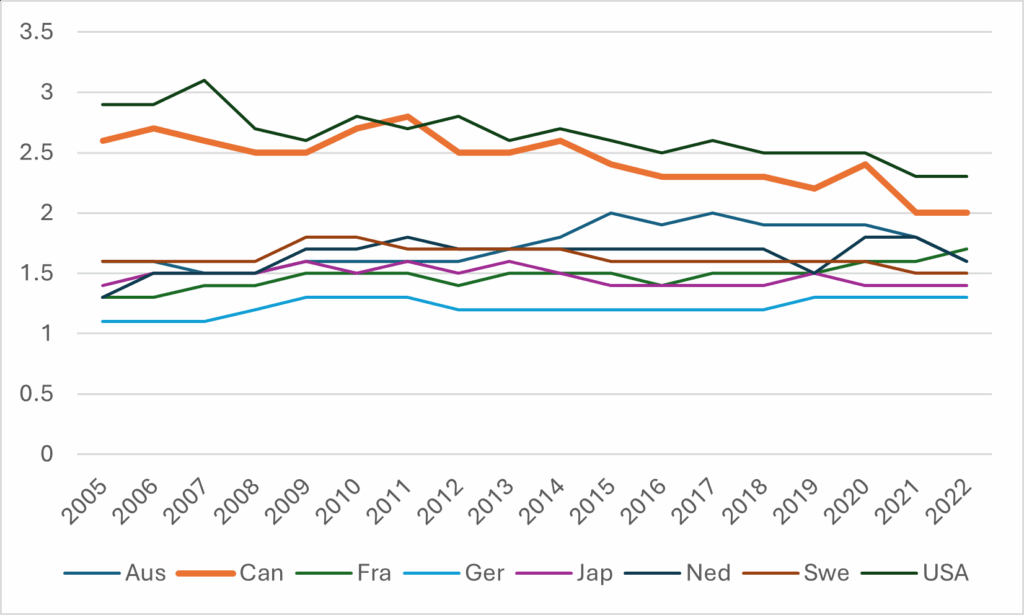 Figure 2: Total Expenditure on Tertiary Institutions as a Percentage of GDP, Select OECD Countries, 2005-2022