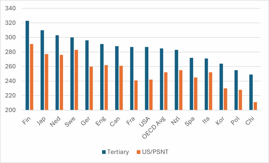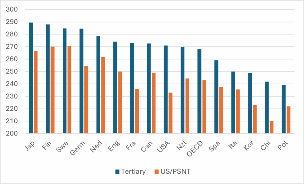 Figures 1, 2 and 3 show PIAAC results for a number of OECD countries, comparing averages for just the Upper Secondary/Post-Secondary Non-Tertiary (which I am inelegantly going to label “US/PSNT”) and Tertiary educational attainment. They largely tell similar stories. Japan and Finland tend to be ranked towards the top of the table on all measures, while Korea, Poland and Chile tend to be ranked towards the bottom. Canada tends to be ahead of the OECD average at both levels of education, but not by much. The gap between US/PSNT and Tertiary results are significantly smaller on the “problem-solving” measure than on the others (which is interesting and arguably does not say very nice things about the state of tertiary education, but that’s maybe for another day). Maybe the most spectacular single result is that Finns with only US/PSNT education have literacy scores higher than university graduates in all but four other countries, including Canada.