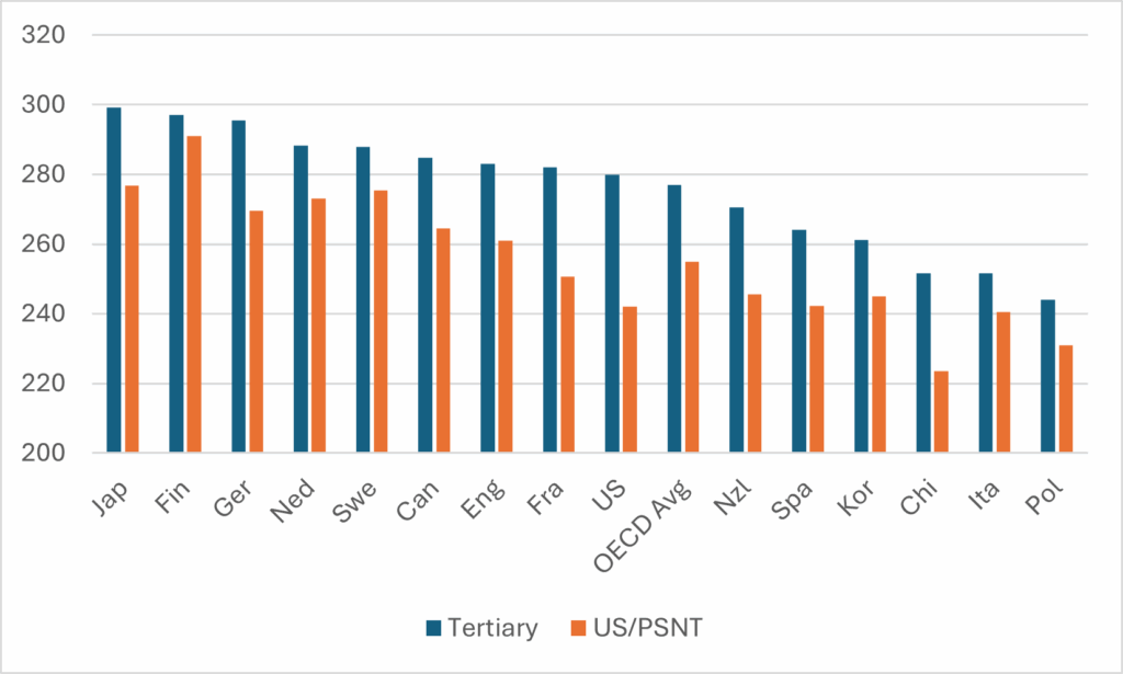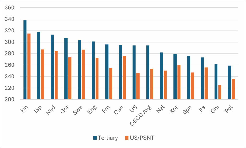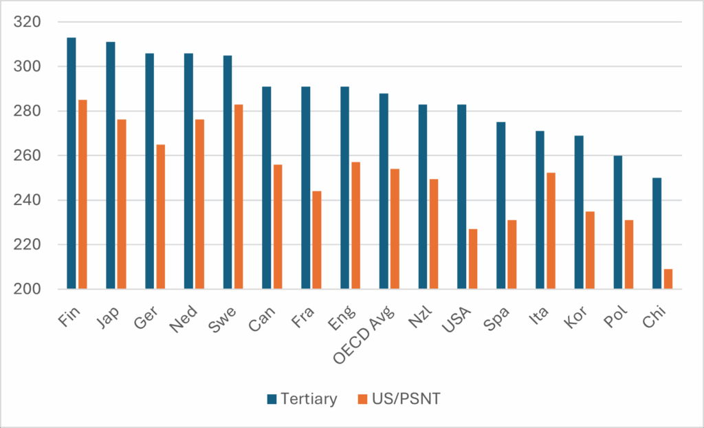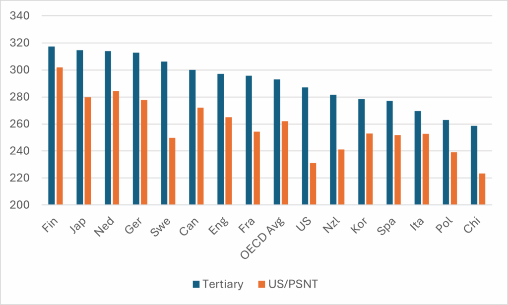 Three weeks ago, the Organization for Economic Co-operation and Development (OECD) released its annual stat fest, Education at a Glance (see last week’s blog for more on this year’s higher education and financing data). The most interesting thing about this edition is that the OECD chose to release some new data from the recent Programme for International Assessment of Adult Competencies (PIAAC) relating to literacy and numeracy levels that were included in the PIAAC 2013 release (see also here), but not in the December 2024 release.