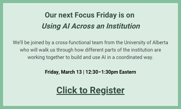 Our next Focus Friday will take place on March 13, and we’ll be joined by a cross-functional team from the University of Alberta who will walk us through how different parts of the institution are working together to build and use AI in a coordinated way.