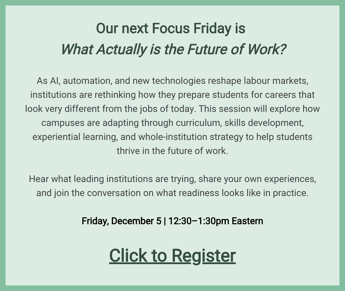 The format of Focus Friday is simple: we’ll start with a few questions to Stephanie, then open the floor to you for a real, coffee-chat style discussion. Bring your questions, your curiosity, and your experiences. We’d love to hear what AI looks like on your campus.