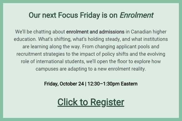 We’ll be turning next to enrolment. How it’s changing, what’s staying the same, and what institutions are learning along the way. That conversation happens on October 24, and registration is already open (see below, in a big green box).