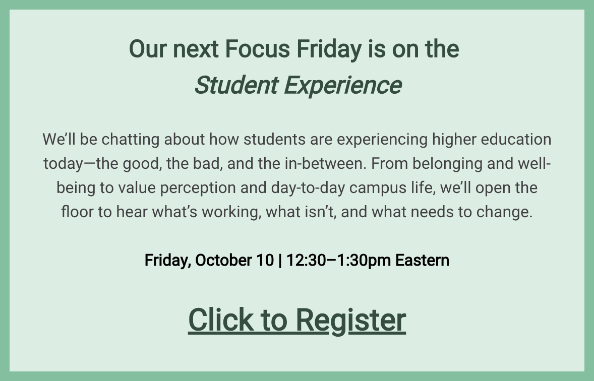 The next Focus Friday will be on October 10th focused on the student experience and student life. I’ll be bringing you some folks directly from your own campuses to lead our discussion. Register via the big green box below.