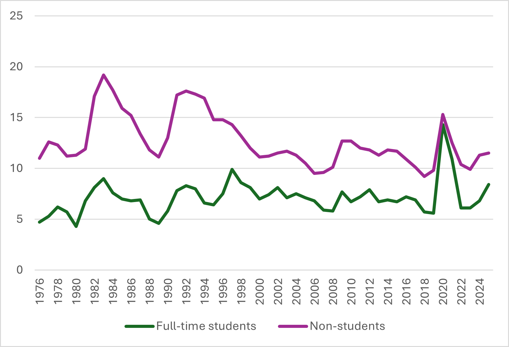 Figure 1: Unemployment Rates during School Months for 20-24 year-olds, Full-Time Students and Non-Students, Canada, 1976-2025