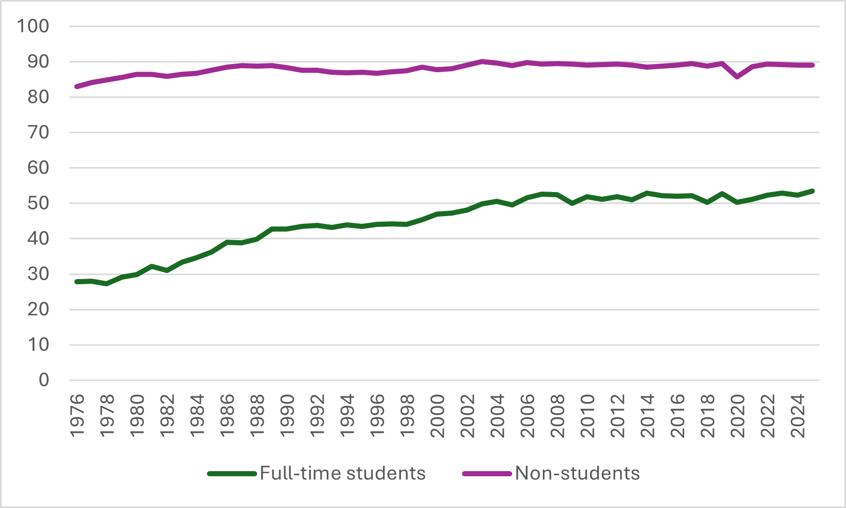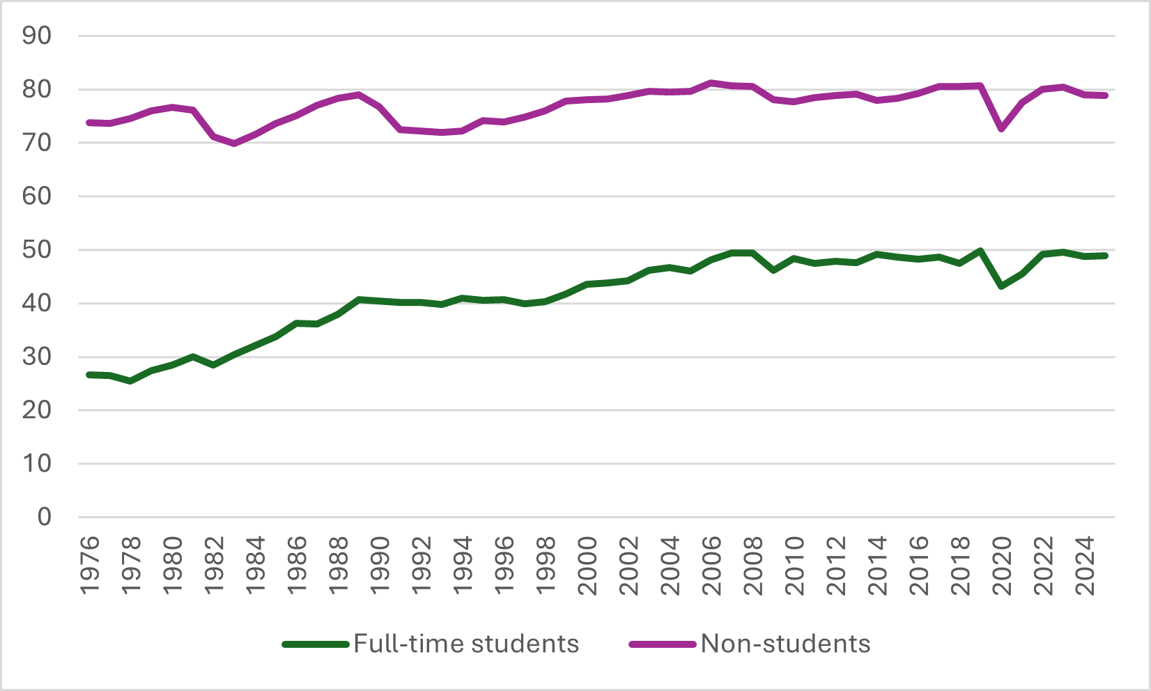 Figure 2: Participation Rates during School Months for 20-24 year-olds, Full-Time Students and Non-Students, Canada, 1976-2025