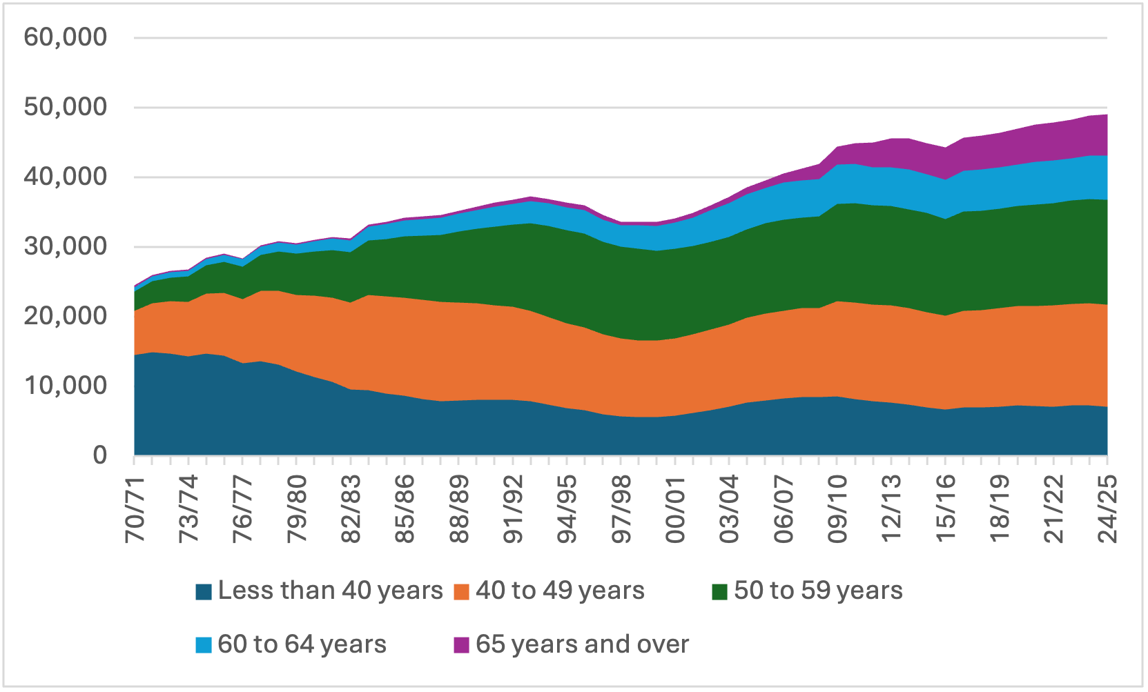 Figure 3: Ranked Academic Staff by Age, Canadian Universities, 1970-71 to 2024-25