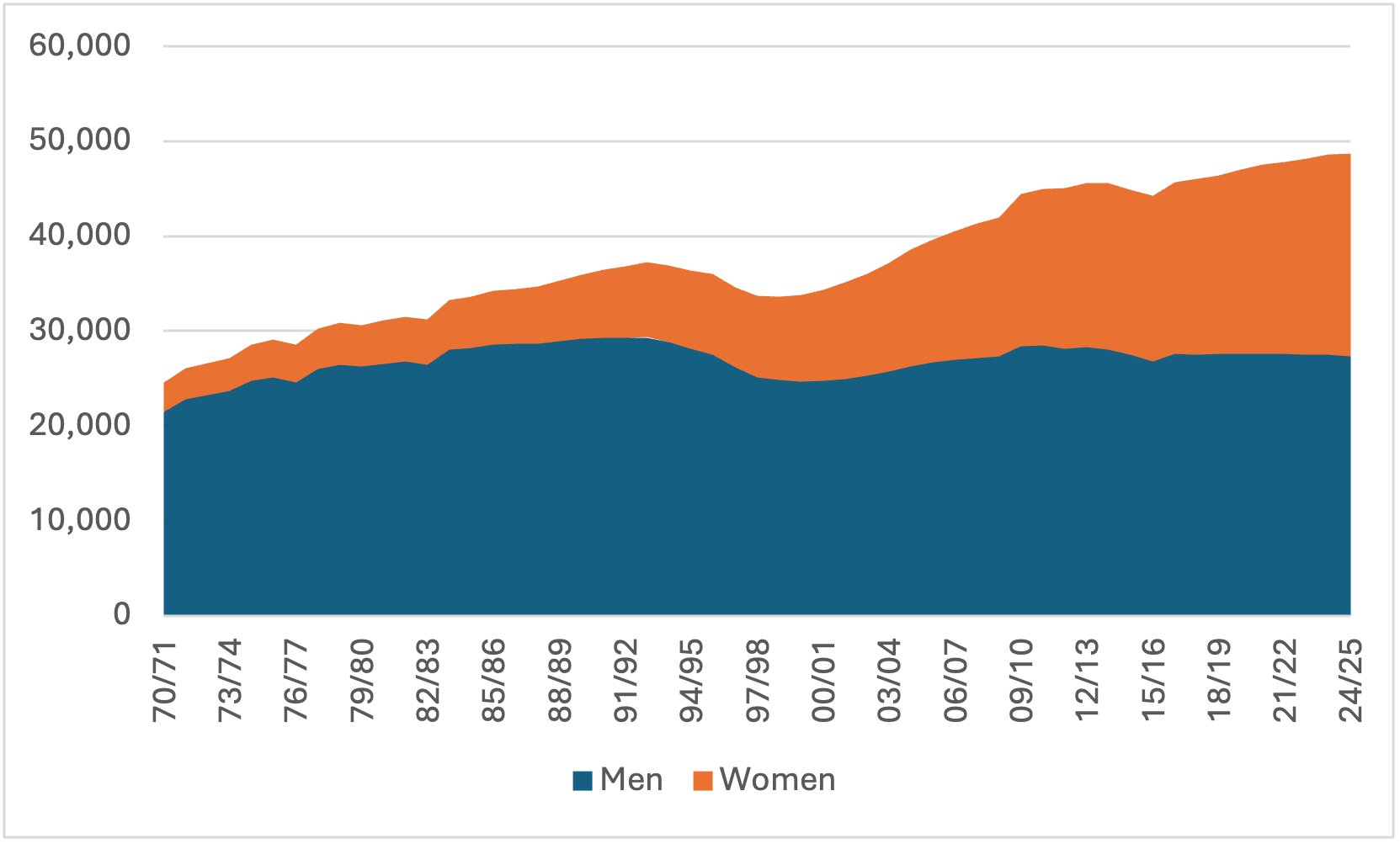 Figure 4: Ranked Academic Staff by Gender, Canadian Universities, 1970-71 to 2024-25