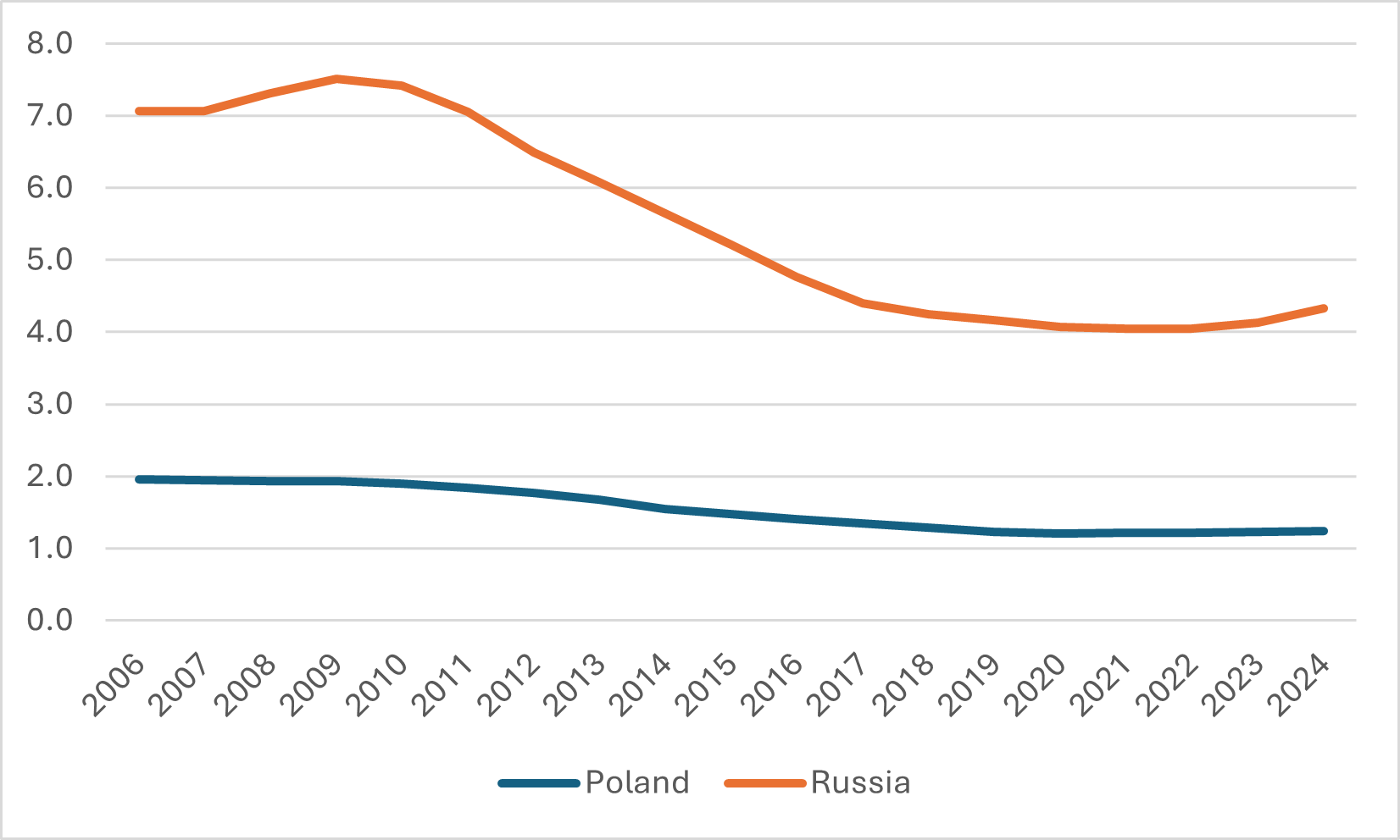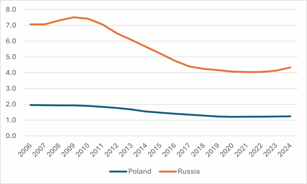 Figure 1: Total Enrolments in Millions, Russia and Poland, 2006 to 2024