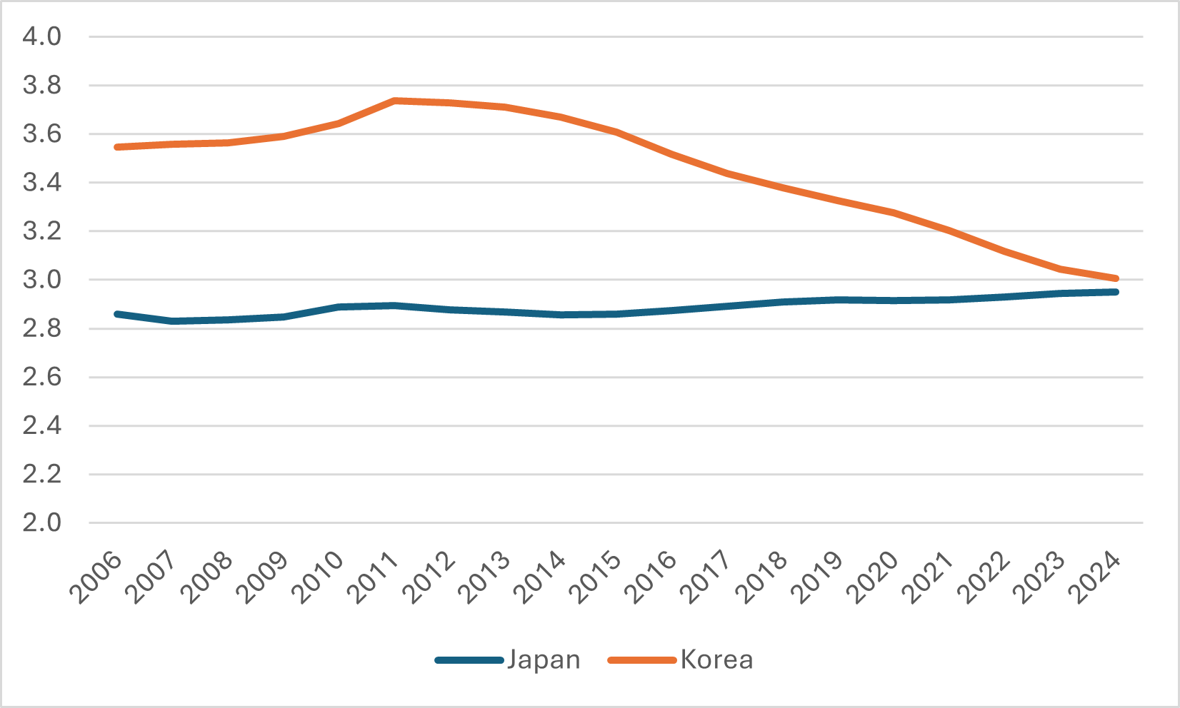 Figure 2: Total Enrolments in Millions, Japan and Korea, 2006 to 2024