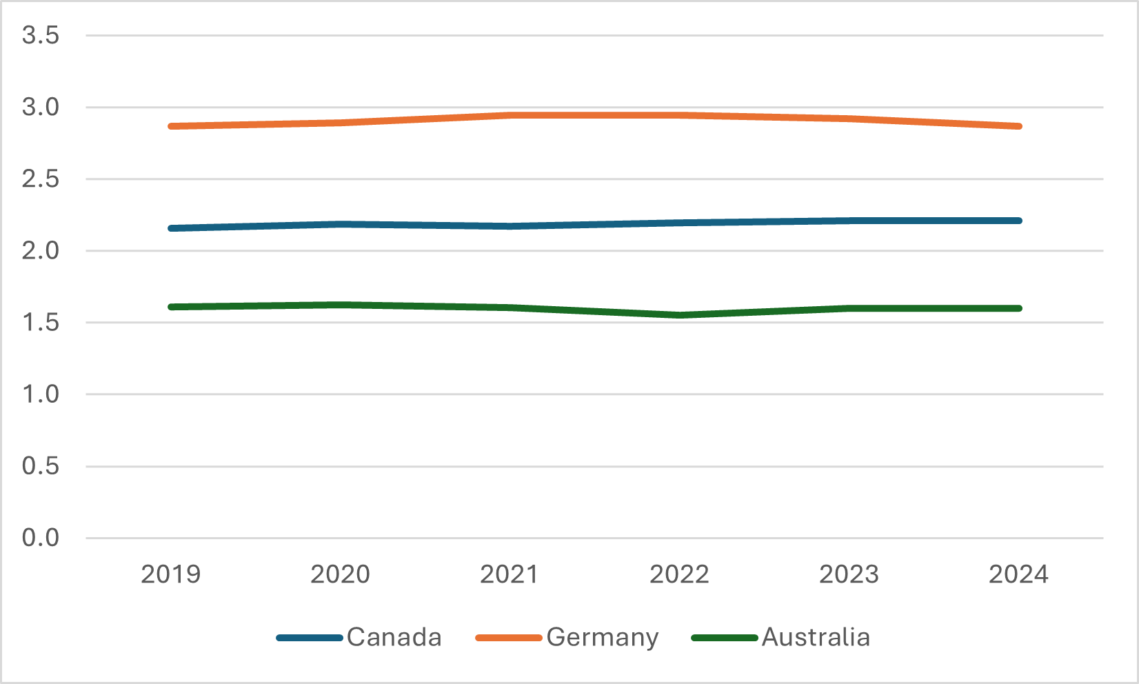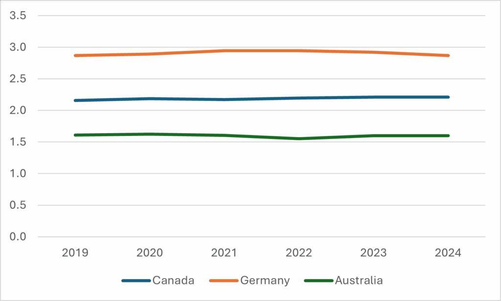 Figure 3: Total Enrolments, in Millions, Canada, Germany and Australia, 2019 to 2024