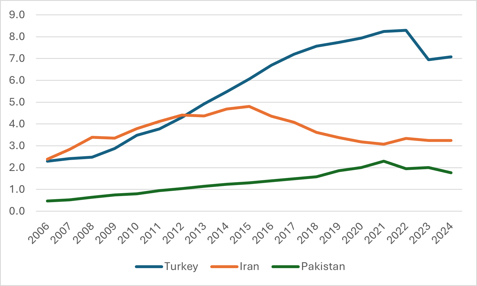 Figure 4: Total Enrolments, in Millions, Turkey, Iran and Pakistan, 2006 to 2024
