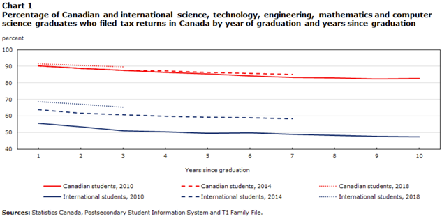 So, the trivial things this graph shows are that: i) both Canadian and international students leave Canada but ii) international students do so more frequently and iii) leaving the country is something that happens gradually over time. The interesting thing it shows, though, is that the most recent cohort (class of 2018) of STEM graduates are more likely to stay than earlier ones, and that this is especially true for international students: the retention rate of international graduates from the class of 2018 was almost fifteen percentage points higher than for the class of 2015.