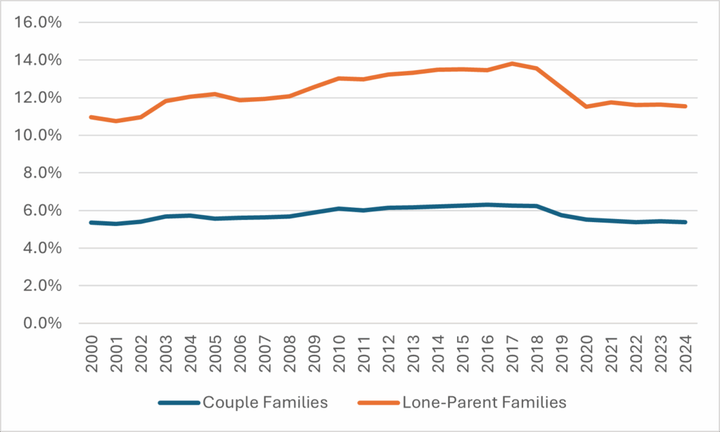 Figure 1: Average Undergraduate Tuition and Fees as a Percentage of Median Family Income, Couple Family and Lone-Parent Families aged 45-54, Canada, 2000-2024