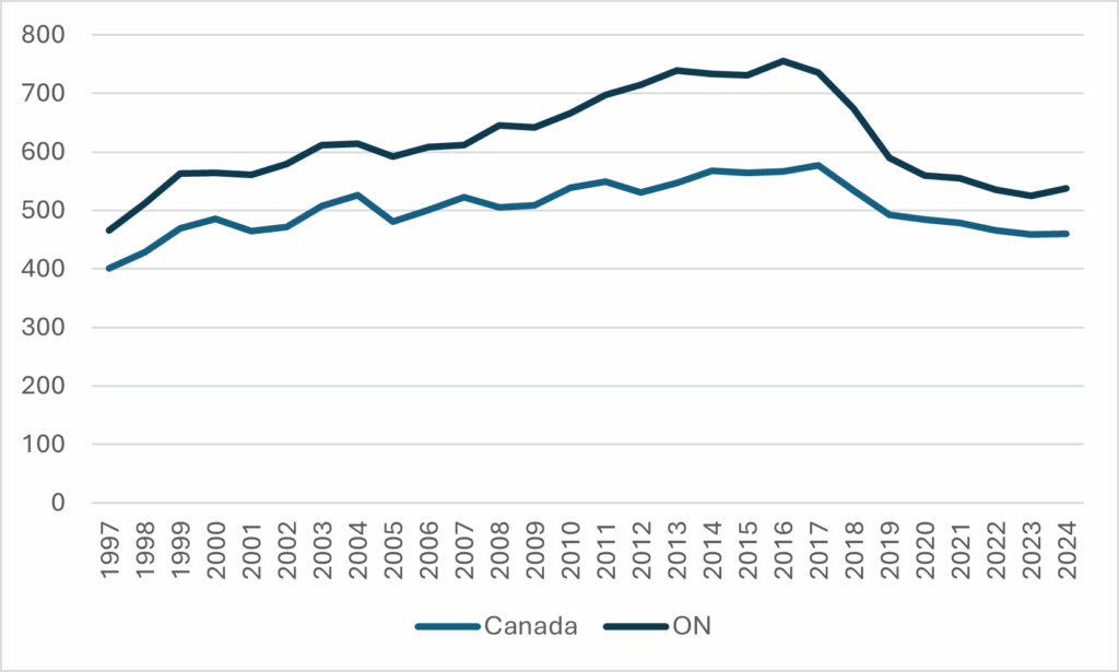 Figure 2: Number of Hours Worked at Median Hourly Income for Canadians Aged 15-24 Required to pay Average Undergraduate Tuition and Fees, Canada and Ontario, 1997-2024