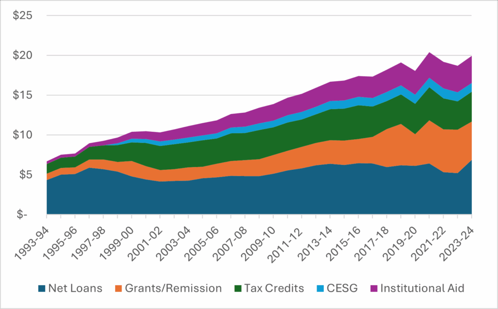 Figure 3: Total Student Financial Assistance by Type, Selected years, 1993-94 to 2023-2024, in Millions, in $2023