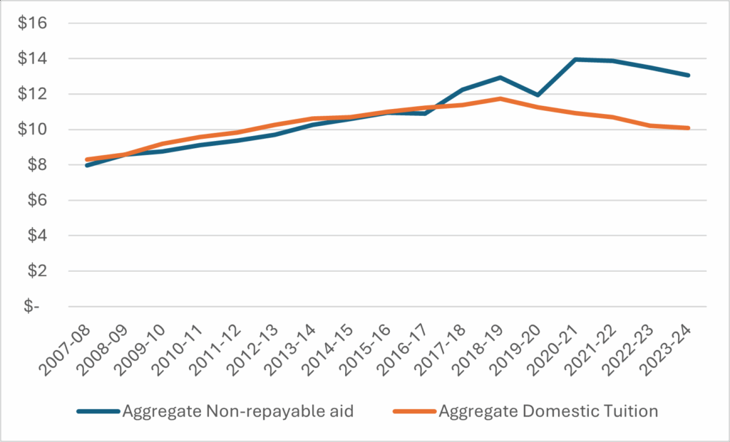 Figure 4: Aggregate Non-Repayable Aid vs Aggregate Domestic Tuition fees, 2007-08 to 2023-24, in Billions, in $2023
