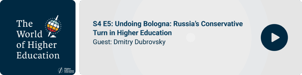 Many faculty fled. Connections with international partners in the West were severed. And then to top it off, the Russian government announced that it would abandon the three degree bachelor’s, master’s doctoral system introduced when the country joined the Bologna Process 20 years earlier.